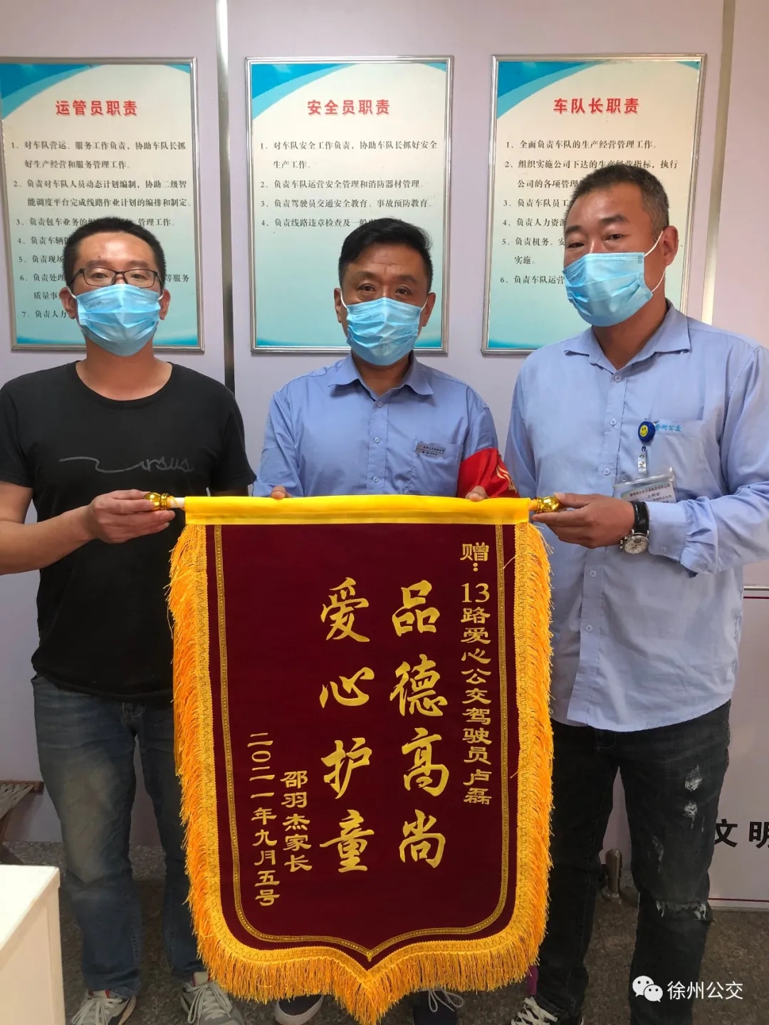 98日,市民邵先生來到京徐巴士公司,送來了一面印有品德高尚,愛心護童的錦旗,感謝13路駕駛員盧磊的愛心善舉。