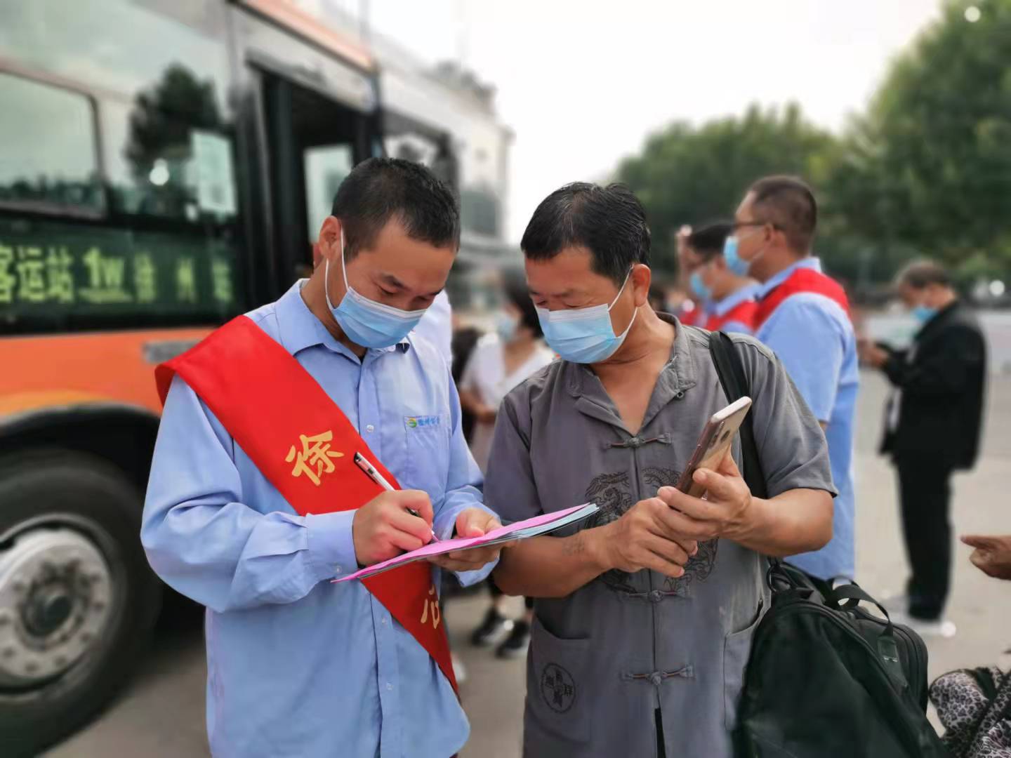 在活動(dòng)現(xiàn)場,志愿者們積極行動(dòng),一邊引導(dǎo)車輛規(guī)范進(jìn)站,一邊疏導(dǎo)乘客有序上下車,解答乘客提問,并幫助乘客調(diào)取健康碼行程碼,方便市民乘車。
