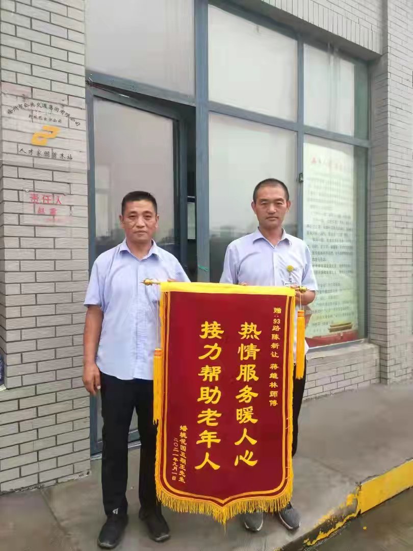 91日下午,在蟠桃花園站臺站有一位年邁的老人,手里緊緊握著一面書有熱情服務(wù)暖人心,接力幫助老年人的錦旗,在雨中等待著93路駕駛員陳新讓、蔣繼林的車輛,想要把這面飽含誠摯謝意的禮物親手送給兩位師傅。