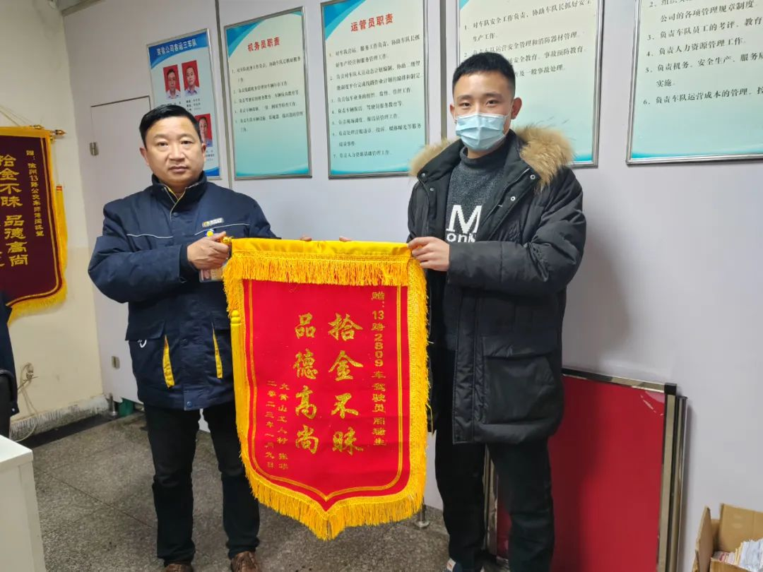 原來(lái),在1月9日上午11時(shí)許,13路駕駛員周瑞生在終點(diǎn)站打掃車輛衛(wèi)生時(shí),發(fā)現(xiàn)座位上有一個(gè)黑色雙肩包。經(jīng)檢查,包內(nèi)有現(xiàn)金3000余元、數(shù)張銀行卡以及醫(yī)院報(bào)告單。周瑞生立即將包交到車隊(duì),與車隊(duì)長(zhǎng)通過(guò)多種途徑,終于聯(lián)系到了失主張先生。當(dāng)日下午1時(shí)左右,失主張先生急切地趕到了車隊(duì)。經(jīng)了解,張先生乘坐13路公交車去兒童醫(yī)院給孩子交住院費(fèi),情急之下把包遺忘在了車上,正在一籌莫展之時(shí),接到了我們的電話。拿回失物的張先生激動(dòng)之情溢于言表,隨即激動(dòng)地拿出現(xiàn)金要表示感謝,被周瑞生婉言謝絕,他表示:“拾金不昧是我們中華民族的傳統(tǒng)美德,我身為一名公交人,更是一名光榮的五星級(jí)駕駛員,這是我應(yīng)該做的。”事后,失主張先生又特意送來(lái)了錦旗以示感謝。