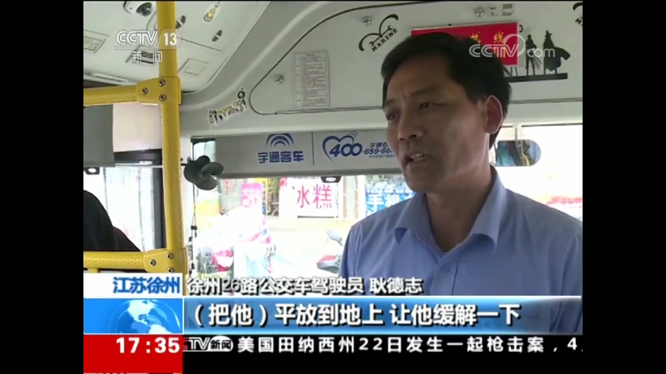 耿德志和昝昱安一邊招呼乘客前來幫忙一邊撥打120。一名自稱是護(hù)士的女乘客說男乘客是癲癇病發(fā),在乘客的齊心幫助下讓男乘客平躺在車廂,把頭歪到一邊,并防止他咬到自己的舌頭。為爭分奪秒救治患病乘客,耿德志在征得車上乘客同意、請示過公司領(lǐng)導(dǎo)后,公交車緊急變身“120”,5分鐘就將車直接開到了距離最近的徐州礦務(wù)集團(tuán)第一醫(yī)院的急診室門口。耿德志在車上照顧發(fā)病乘客,昝昱安和熱心乘客一起跑到急診喊來醫(yī)護(hù)人員??吹结t(yī)護(hù)人員實(shí)施救治,并聯(lián)系到患病乘客的家人后,耿德志和昝昱安才放心地回到崗位上。