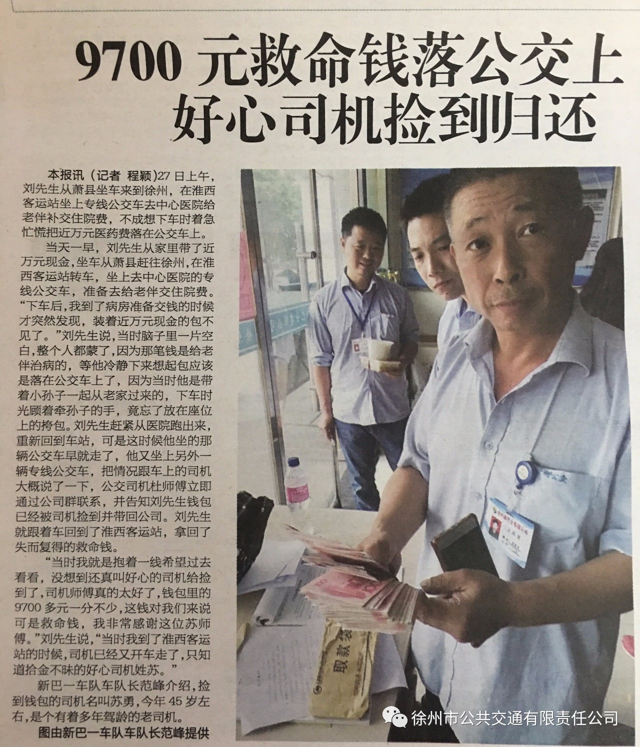 車隊管理人員打開包尋找乘客的聯(lián)系方式,發(fā)現(xiàn)包里有一個信封,信封里面裝著9700元現(xiàn)金,便立即將包妥善保管。不久,失主劉先生來到調(diào)度室尋找,看到失而復(fù)得的包裹十分激動,他說:“我抱著一線希望來這兒看看,沒想到還真叫好心的司機給撿到了,9700元一分不少。這錢對我們來說是救命錢,今早到醫(yī)院給老伴補交住院費的,我非常感謝蘇師傅”。
