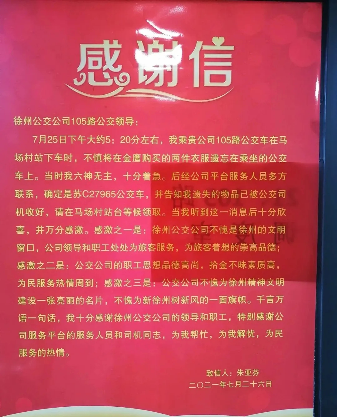“我一時疏忽丟了東西,如果沒有袁丁師傅,我這兩套西服就不知所蹤了,真的非常感謝。”7月26日,乘客朱先生送來感謝信,對徐州公交的暖心服務表示贊許。