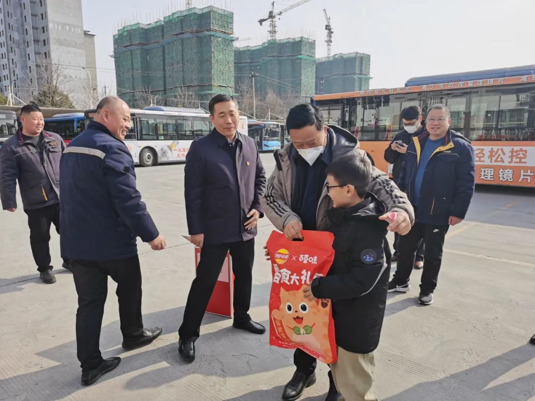 1月22日農(nóng)歷大年初一,在城北公司韓山首末站、新區(qū)公司建筑學(xué)院首末站等場站調(diào)度室,曹震與堅守崗位的一線員工一一握手,叮囑他們加強個人防護,注意安全駕駛、確保車場安全,對他們放棄與家人團聚、堅守一線的敬業(yè)精神表示感謝,并向其致以節(jié)日的慰問,送上了節(jié)日慰問品。