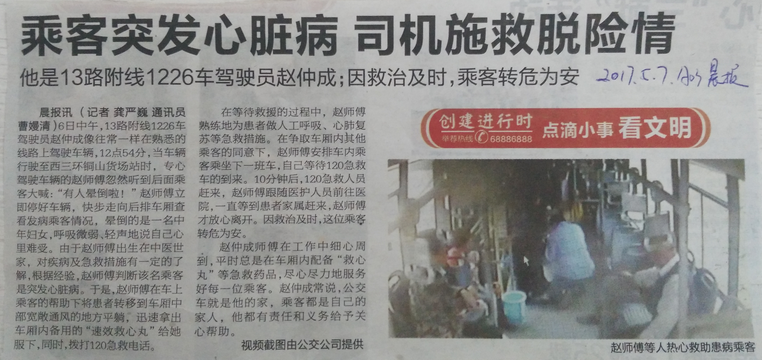 當(dāng)天中午,13路附線1226車駕駛員趙仲成像往常一樣在熟悉的線路上駕駛車輛。12點(diǎn)54分,當(dāng)車輛行駛至西三環(huán)銅山貨場(chǎng)站時(shí),專心駕駛車輛的趙師傅忽然聽到后面乘客大喊:“有人暈倒啦”,趙師傅立即停好車輛、快步走向后排車廂查看發(fā)病乘客情況,暈倒的是一名中年婦女,呼吸微弱、輕聲地說自己心里難受。由于趙師傅出生在中醫(yī)世家,對(duì)疾病及急救措施有一定的了解,根據(jù)經(jīng)驗(yàn),趙師傅判斷該名乘客是忽發(fā)心臟病,于是,趙師傅在車上乘客的幫助下將患者轉(zhuǎn)移到車廂中部寬敞通風(fēng)的地方平躺,迅速拿出車廂內(nèi)備用的“速效救心丸”給她服下,同時(shí),撥打120急救電話。在等待救援的過程中,趙師傅熟練地為患者做人工呼吸、心肺復(fù)蘇等急救措施。在爭取車廂內(nèi)其他乘客的同意下,趙師傅安排車內(nèi)乘客乘坐下一班車,自己等待120急救車的到來。10分鐘后,120急救人員趕來,趙師傅跟隨醫(yī)護(hù)人員前往醫(yī)院,一直等到患者家屬趕來,趙師傅才放心的離開。