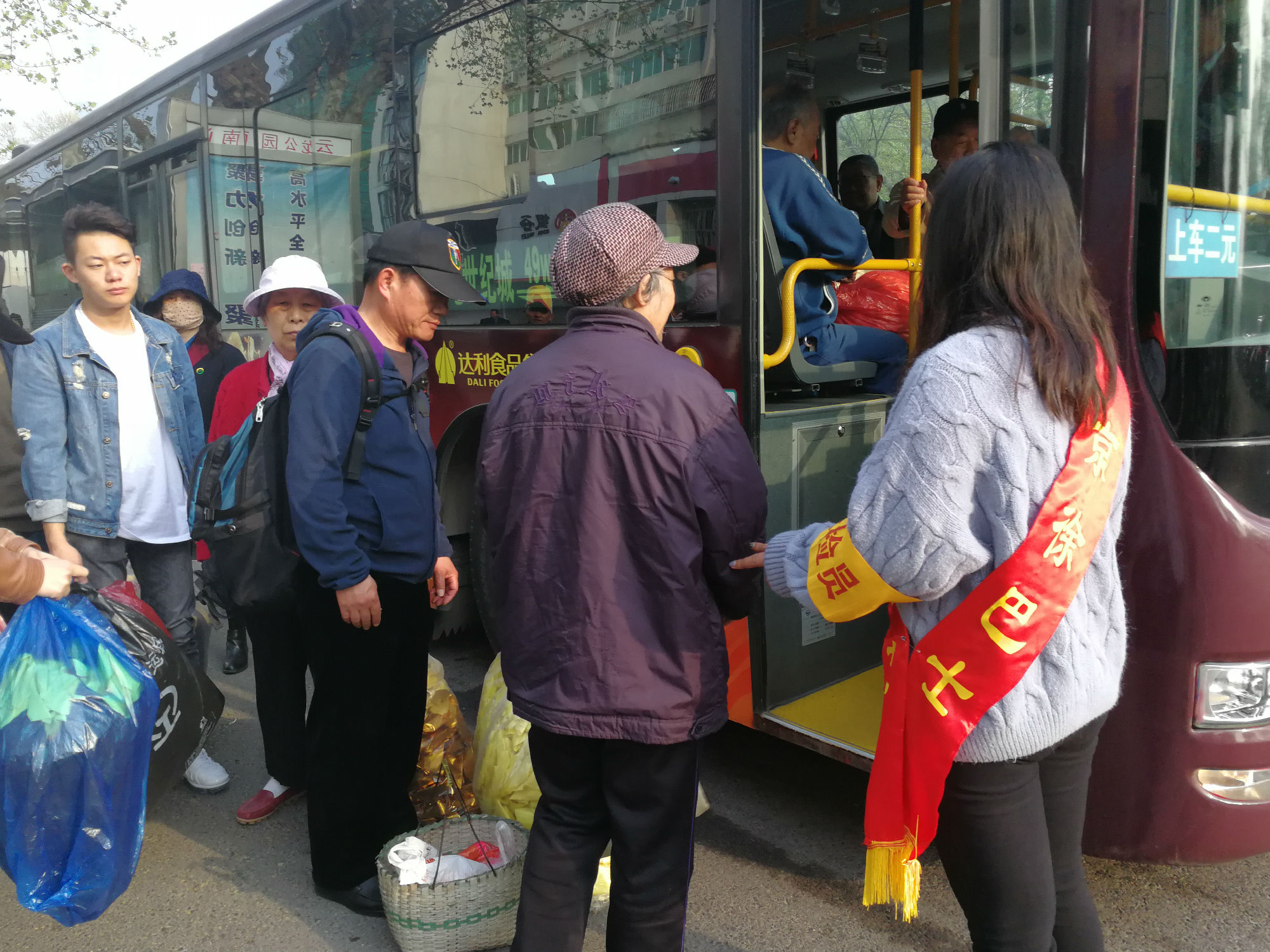 云龍公園南門,站滿了拿著大包小包的乘客?!按蠹遗藕藐?duì),注意安全,不要擁擠,需要換零錢的乘客可以到零幣兌換處換取零錢?!敝驹刚呶⑿χS持現(xiàn)場秩序。人群中有位提著兩個大包裹的大媽,志愿者走到大媽跟前,關(guān)切地詢問:“大媽,我來幫您把包裹拿上車吧?!敝驹刚咭皇?jǐn)v扶老人上車,一手拿著物品,為其安排好座位并叮囑大媽注意安全。一班車走后,還沒撈著喝口水,現(xiàn)場又聚滿了乘客,志愿者們又開始忙碌起來:“大爺,車還要一會才能來,您先坐這歇一會吧。”志愿者拿來板凳,讓老大爺坐下休息,老大爺十感動,說道:“你們真貼心。